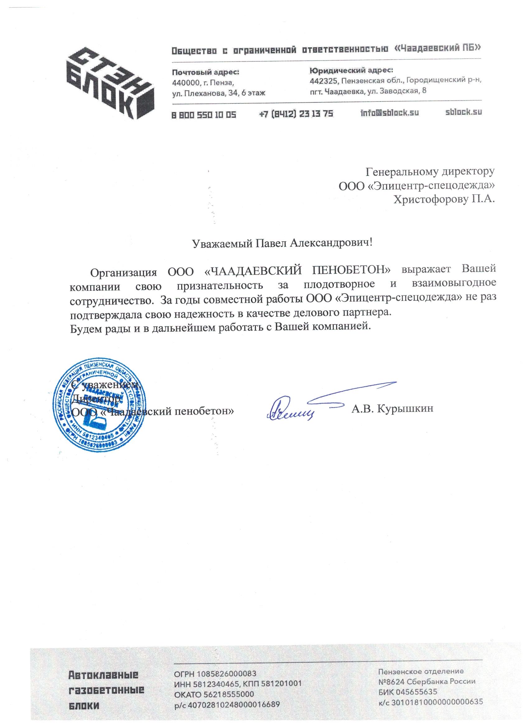 ООО "Чаадаевский пенобетон" выражает свою признательность за плодотворное и взаимовыгодное сотрудничество. За годы совместной работы ООО "Эпицентр-спецодежда" не раз подтверждала свою надежность в качестве делового партнера.