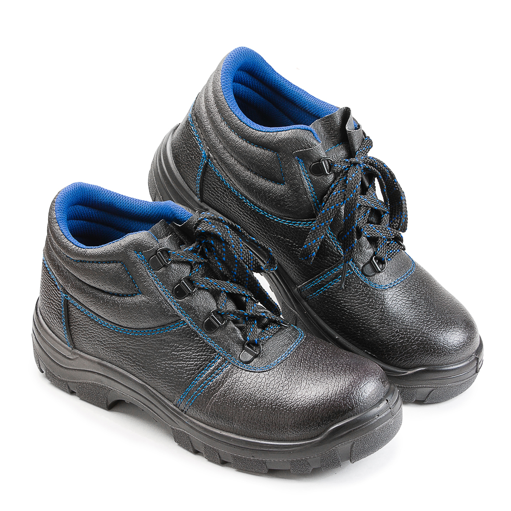 Ботинки изготовлены методом прямого литья подошвы к заготовке верха обуви. Имеется пристроченная прилитая задинка. Верх ботинок изготовлен из натуральной кожи. Подкладка ботинок выполнена из текстильного материала, стойкого к истиранию. В верхней части ботинок выполнен мягкий кант из текстильного материала. Ботинки завязываются на шнурки и имеют глухой клапан. Шнуровка производится с использованием металлических люверсов. На глухом клапане в середине имеется мягкая вставка из поролона. Стелька вкладная. В носочной части стопы выполнен внутренний защитный подносок из металла ударной прочностью 200 Дж. На правой и левой боковинах выполнены световозвращающие элементы в виде полосок для лучшей видимости работника. Выполнена контрастная отстрочка синего цвета в тон подкладки и цветной нити на шнурках. Подошва однослойная, полиуретановая, маслобензостойкая. Есть внутренняя амортизирующая вставка в пяточной части подошвы. Глубина профиля ходового слоя подошвы составляет 3,5 мм. Цвет ботинок черный.
