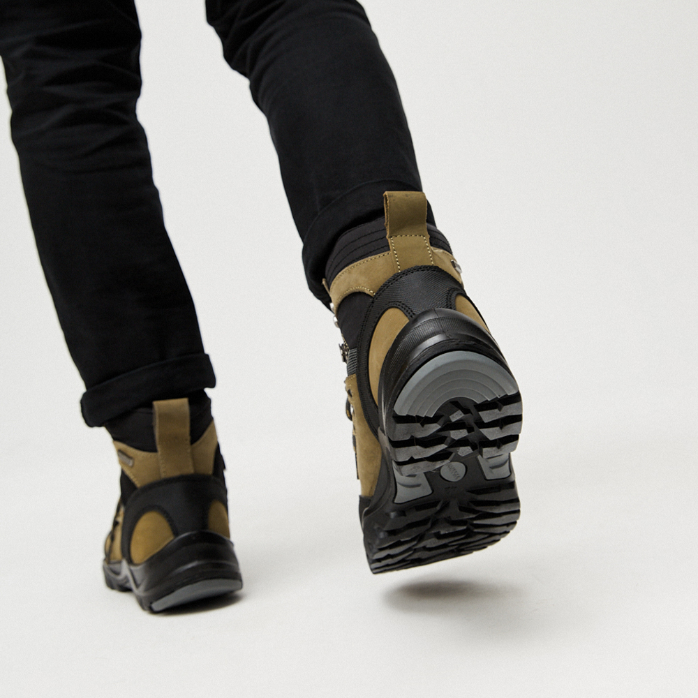 Мужские ботинки WANNGO из натурального нубука предназначены для активного отдыха и повседневных прогулок по городу. В конструкции верха предусмотрен "глухой" клапан, обеспечивающий защиту стопы в обуви от попадания посторонних предметов, пыли и пр. Водонепроницаемая и «дышащая» подкладка с мембраной WG-TEX обеспечивает идеальный комфорт даже в сырую погоду. Вкладная стелька Smart Insole комфортно поддерживает стопу и обладает амортизационными свойствами. Для защиты от механических повреждений носочная части ботинка имеет накладку из полимерного материала ТПУ. Двухслойная подошва с промежуточным слоем из пористого полиуретана облегчает вес ботинка, сохраняет тепло и снимает нагрузку во время ходьбы. Литьевой метод крепления верха к подошве гарантирует водонепроницаемое соединение. Нижний ходовой слой выполнен из резины с глубоким протектором создает надежное сцепление с грунтом и препятствует скольжению. Рекомендуемый температурный режим: от 5 до -10