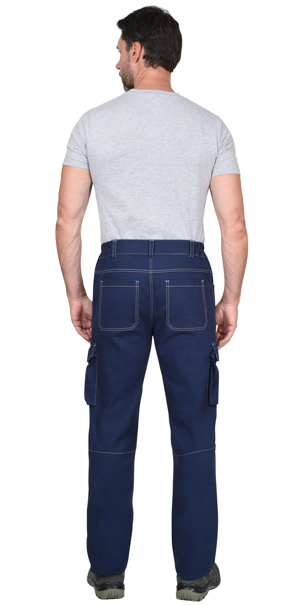 Брюки прямого силуэта с контрастной отстрочкой, с застежкой гульфика на молнию YKK и пуговицу, с карманом с фигурным входом и часовым карманом на правой половинке. На боковых швах накладные объемные карманы с фигурным клапаном на липучке. Изделие с объемными наколенниками с карманом для амортизационных накладок и застежкой на липучке по нижнему краю. Брюки с задними накладными фигурными карманами, отрезной кокеткой, с притачным поясом, частично стянутым резинкой ткацкой по боковым сторонам для лучшего прилегания. На поясе шлевки, одна из которых контрастного цвета с полукольцом для карабина.