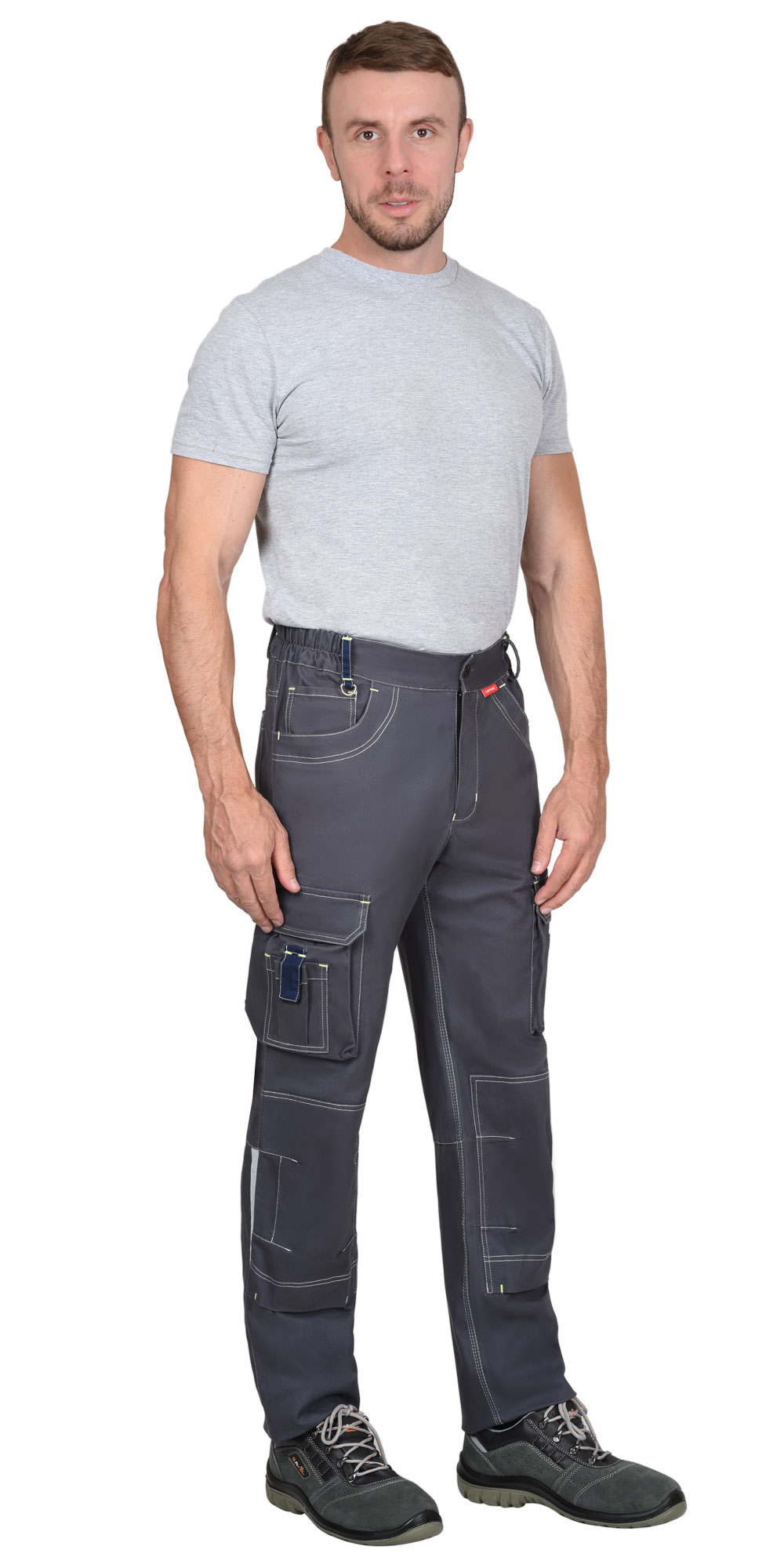 Брюки прямого силуэта с контрастной отстрочкой, с застежкой гульфика на молнию YKK и пуговицу, с карманом с фигурным входом и часовым карманом на правой половинке. На боковых швах накладные объемные карманы с фигурным клапаном на липучке. Изделие с объемными наколенниками с карманом для амортизационных накладок и застежкой на липучке по нижнему краю. Брюки с задними накладными фигурными карманами, отрезной кокеткой, с притачным поясом, частично стянутым резинкой ткацкой по боковым сторонам для лучшего прилегания. На поясе шлевки, одна из которых контрастного цвета с полукольцом для карабина.