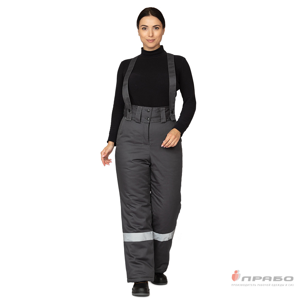 Брюки: прямые, с притачной утеплённой подкладкой, с центральной застёжкой гульфик на молнию. Притачной утеплённый пояс, более широкий на спинке, застёгивается на 2 пуговицы. На поясе пять шлёвок. Бретели пристёгиваются к поясу на пуговицы, со стороны спинки бретели выполнены частично с открытой эластичной лентой. Задние половинки с вытачками на талии обеспечивают силуэтную посадку.