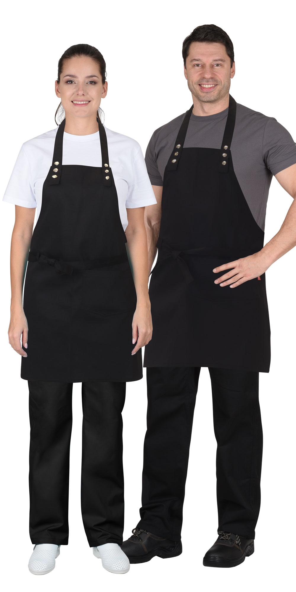 Фартук с нагрудником и с боковыми завязками для регулировки объема. Съёмная шейная бретель, пристёгивающаяся на кнопки. В нижней левой части накладной карман. На правой стороне фартука, на уровне притачивания боковых завязок, шлёвка.