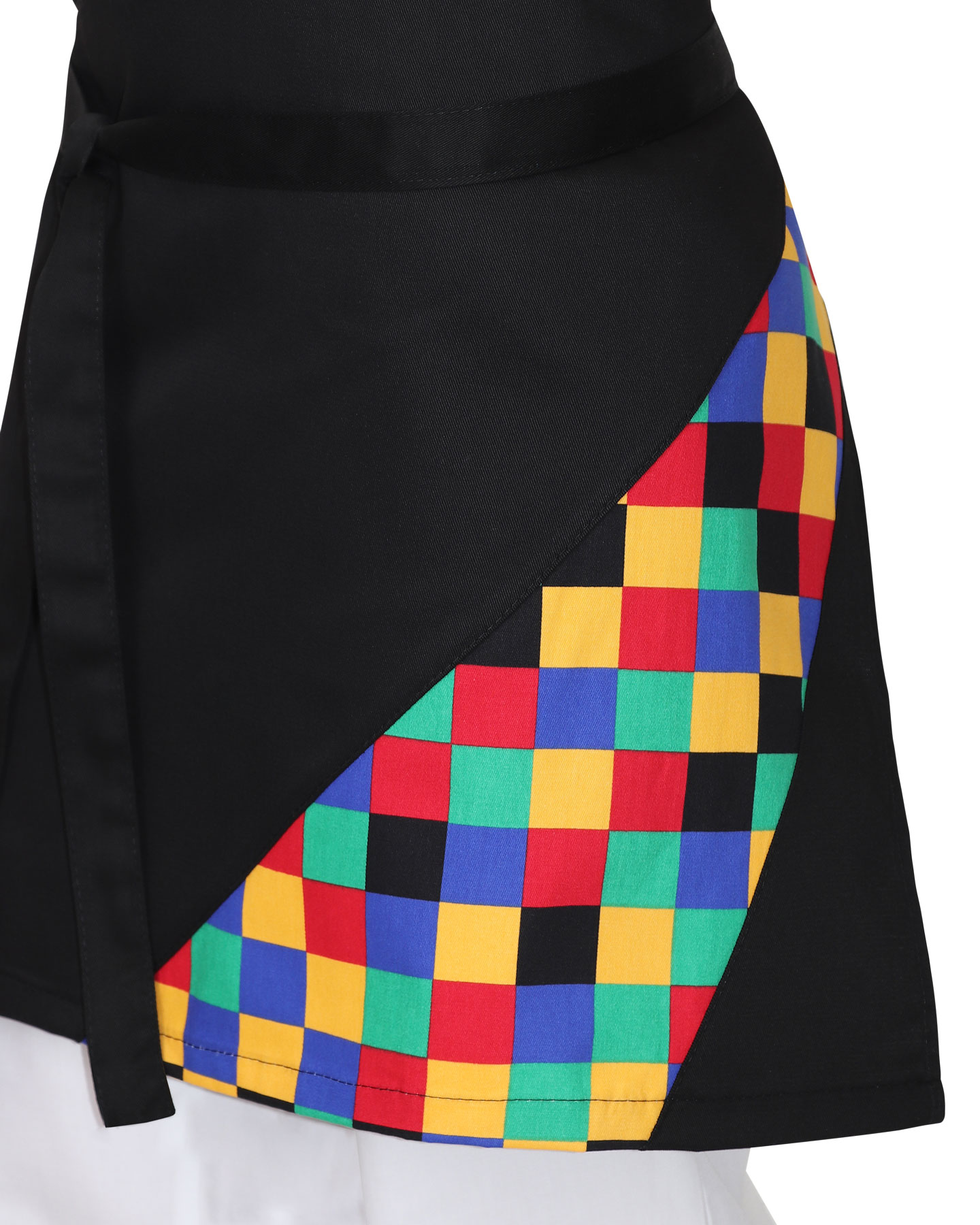Фартук с нагрудником и с боковыми завязками для регулировки объема. Съёмная шейная бретель, пристёгивающаяся на кнопки. На шейной бретели с левой стороны вставлена отделочная деталь из отделочной ткани. В нижней части фартука расположен карман, выполненый из отделочной ткани. С левой стороны отрезная декоративная деталь из отделочной ткани.