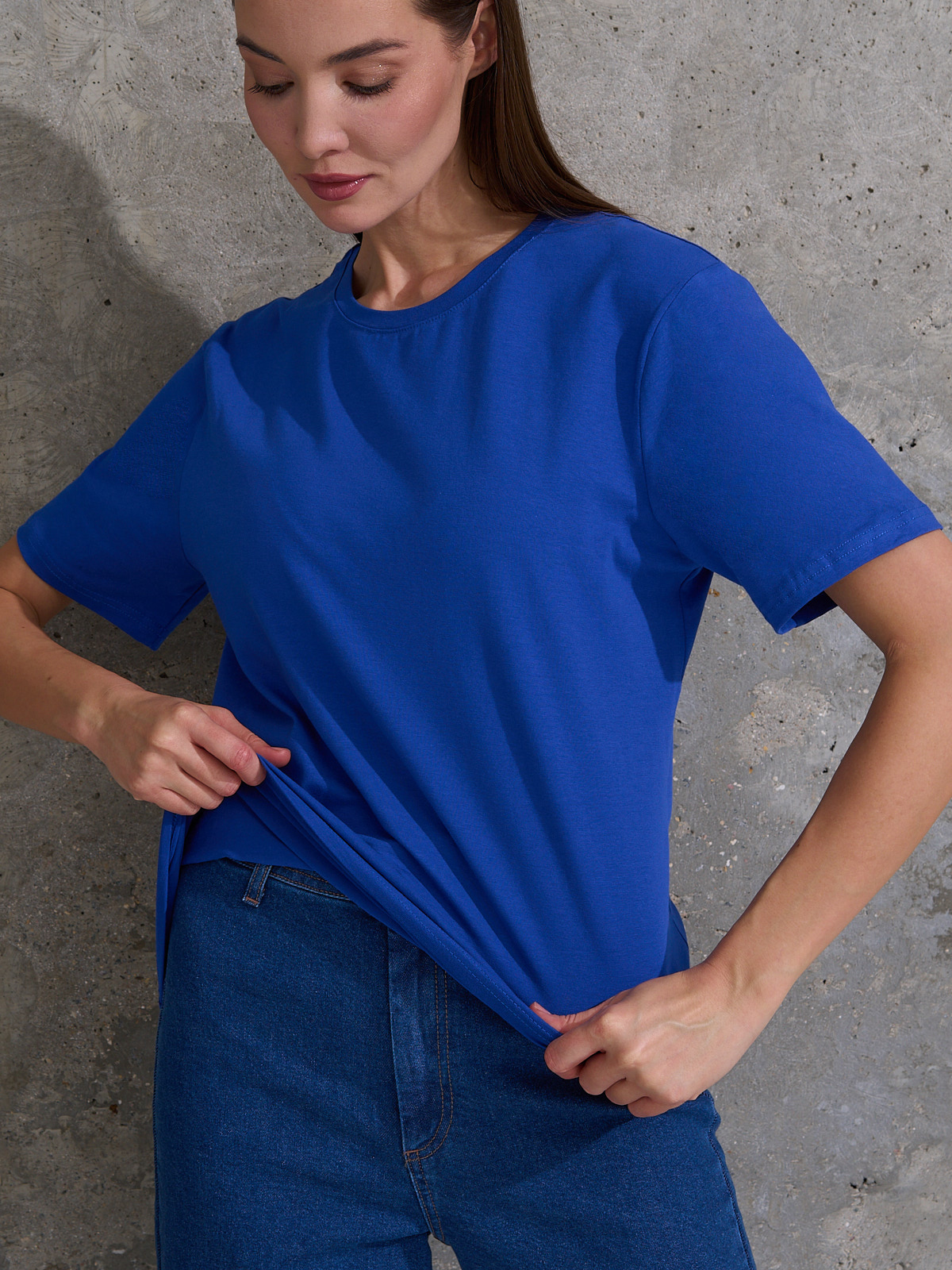 Футболка прямого кроя, с втачными длинными рукавами. По линии горловины втачен ворот из эластичного полотна с 5% добавлением лайкры. Перед и спинка цельнокроеная. Плечевые швы обтачены бейкой из основного полотна, в край проложена отделочная строчка. Низ футболки и рукава подогнуты и подшиты на распошивальной машине. Изделие хорошо себя зарекомендовала в корпоративной культуре, повышенная износостойкость, прочность и долговечность, комфортно в ношении, устойчивость к воздействию воды и солнца: не выгорает, не меняет цвет после стирки и сушки. Устойчиво к усадке, не мнется и не деформируется после долгого времени эксплуатации.