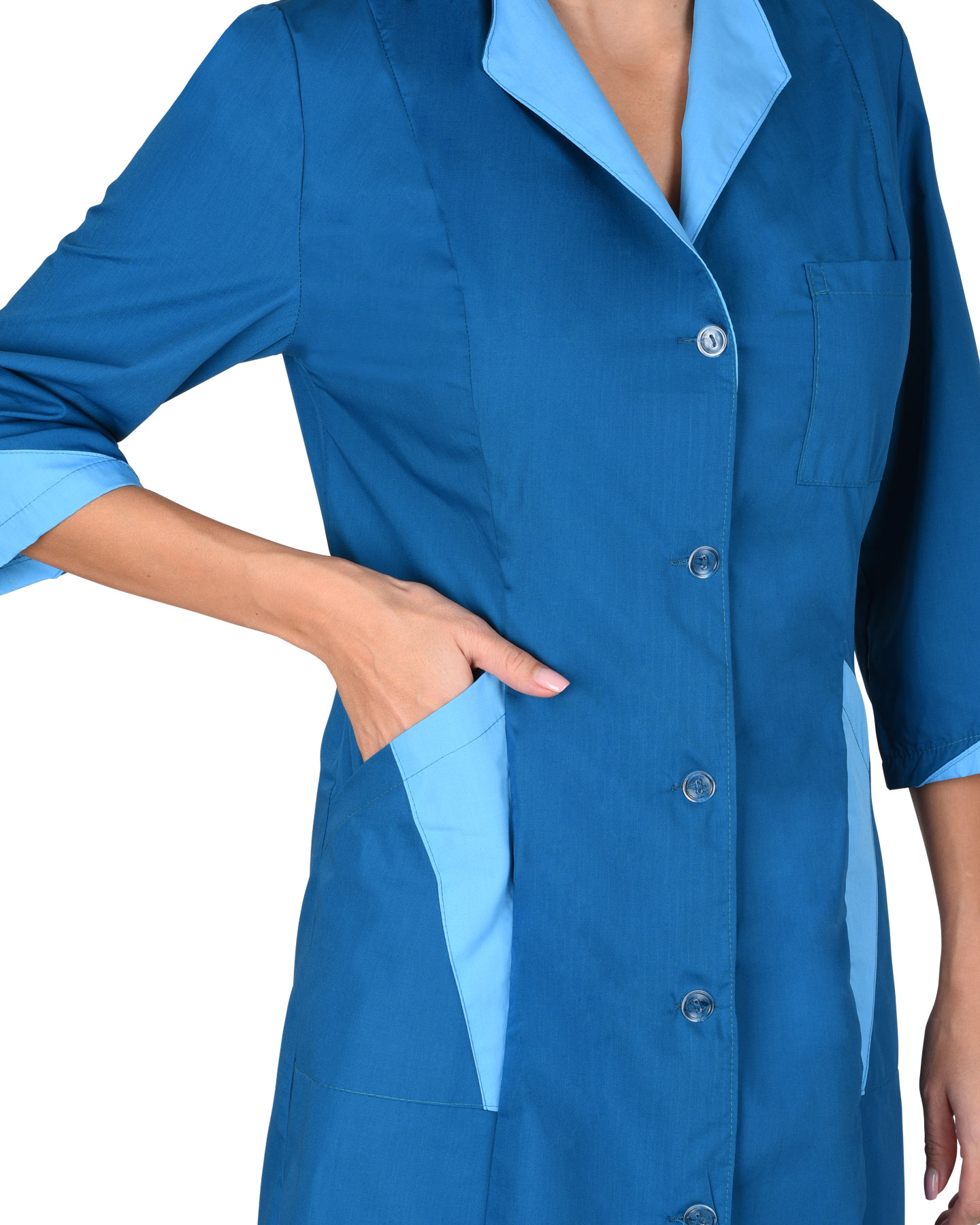 Халат полуприлегающего силуэта, слегка расширенный к низу. Застёжка на пуговицы, рельефы. Воротник, часть нижних карманов и низ рукавов 3/4 из отделочной ткани.