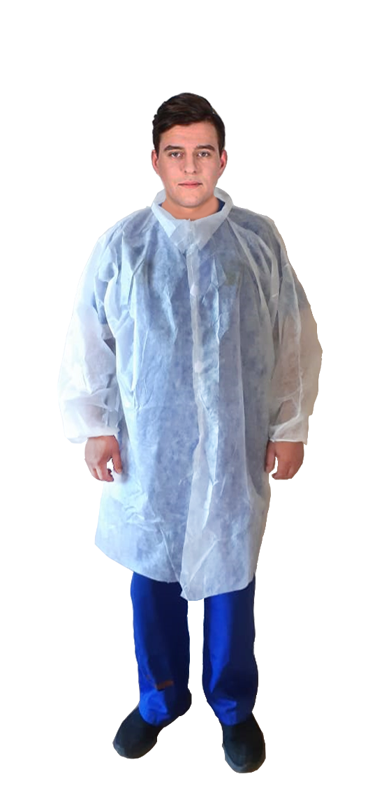 Халат предназначен для защиты посетителей лечебных и других учреждений, где требуется соблюдение санэпидрежима.  Халат изготовлен из нетканого материала типа "Спанбонд" , цвет белый, плотностью 17(25) г/м2 , с контактной застежкой в области переда,  срез рукава обработан резинкой, V-образная горловина без обработки. Халат за счет Т-образного раскроя не стесняет движений. Длина халата 110см. Ширина по нижнему краю изделия в развернутом виде 140см. Материалы, из которых изготовлен халат гипоаллергенны и не содержат латекса.