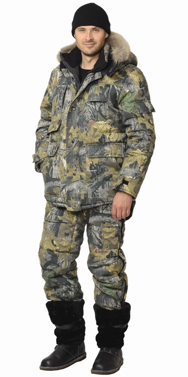 Костюм для охотников выполнен из плотной не шуршащей ткани с ВО пропиткой. Куртка с притачной утеплённой подкладкой, с центральной застёжкой на "молнию" внутренним и внешними ветрозащитными клапанами с кнопками и "липучками"; воротник - "стойка"; с пристёгивающимся утеплённым капюшоном с меховой опушкой, с различными карманами, с регулировкой ширины низа куртки, с внутренней ветрозащитной юбкой, рукава с внутренними трикотажными манжетами.