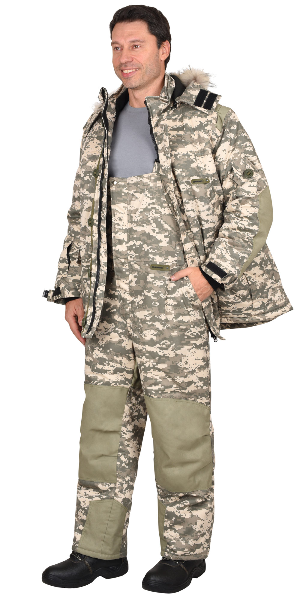 Куртка прямого силуэта, удлинённая, с притачной утеплённой подкладкой, со съёмным капюшоном с меховой опушкой, с центральной бортовой застёжкой на тесьму - «молния» и ветрозащитным клапаном, застёгивающимся на петли и пуговицы, с воротником стойка, верхними и нижними карманами. Рукава втачные трёхшовные с манжетами. По верху проймы втачаны детали в виде валиков из ткани «Панакота» оливкового цвета для удержания ремня оружия, валики закреплены четырьмя закрепками. Ширина куртки по талии регулируется при помощи эластичного шнура.