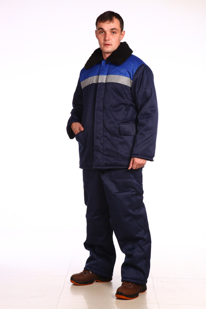 Куртка простеганная, с супатной застежкой на пуговицы. Кокетки полочки и спинки из отделочной ткани со светоотражающим полосой шириной 50 мм, притачной меховой воротник, утепленный капюшон крепится на петли-пуговицы. Популярная модель для представителей любых рабочих специальностей из прочной, легкой непродуваемой синтетической ткани.