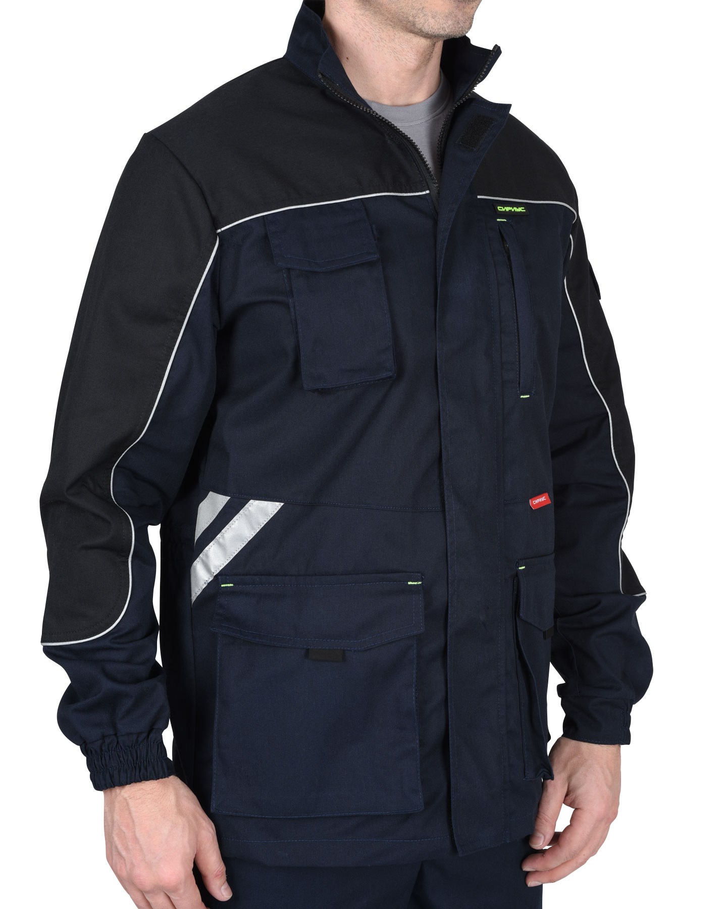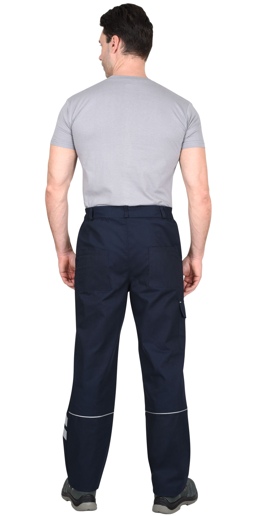 Брюки с притачным поясом с эластичной лентой по боковым швам, застегивающимся на пуговицу, со шлевками, с застежкой гульфика на молнию, с различными функциональными карманами, с элементами из СВ канта и СОП, обеспечивающие безопасность работы в условиях пониженной видимости.