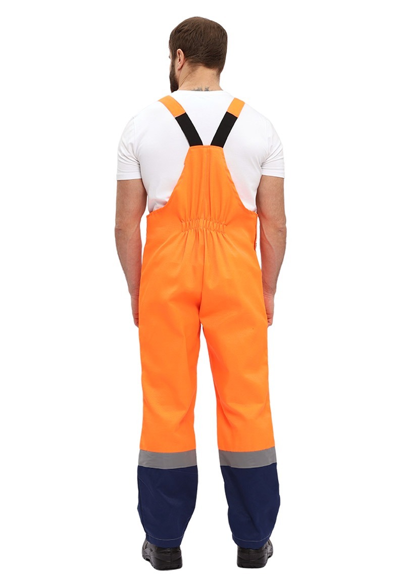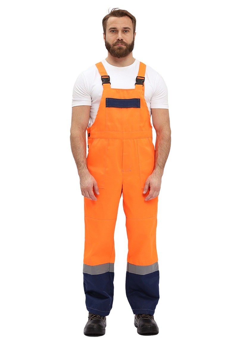 Костюм мужской, летний, прямого силуэта, состоит из куртки и полукомбинезона. Куртка: - центральная супатная застежка на пуговицы - отложной воротник - кокетки полочек и спинки выделены световозвращающей лентой СОП - нагрудные накладные карманы с отделением под ручку - нижние объемные накладные карманы - рукав на притачной манжете с застежкой на пуговицу, выделены световозвращающей лентой СОП, в области локтя-усилительные накладки - притачной, регулируемый по ширине за счет эластичной тесьмы “резинка” по боковым сторонам, пояс Полукомбинезон: - отрезная грудка на притачном поясе; - регулируемые по длине бретели; - нагрудный карман с защитным клапаном на контактной ленте “липучка” - объемные боковые накладные карманы; - центральная застежка гульфик на молнии - дополнительная застежка на пуговицу в правом боковом шве - линия талии спинки регулируется по ширине за счет эластичной тесьмы “резинка” - нижняя часть выделена световозвращающей лентой СОП