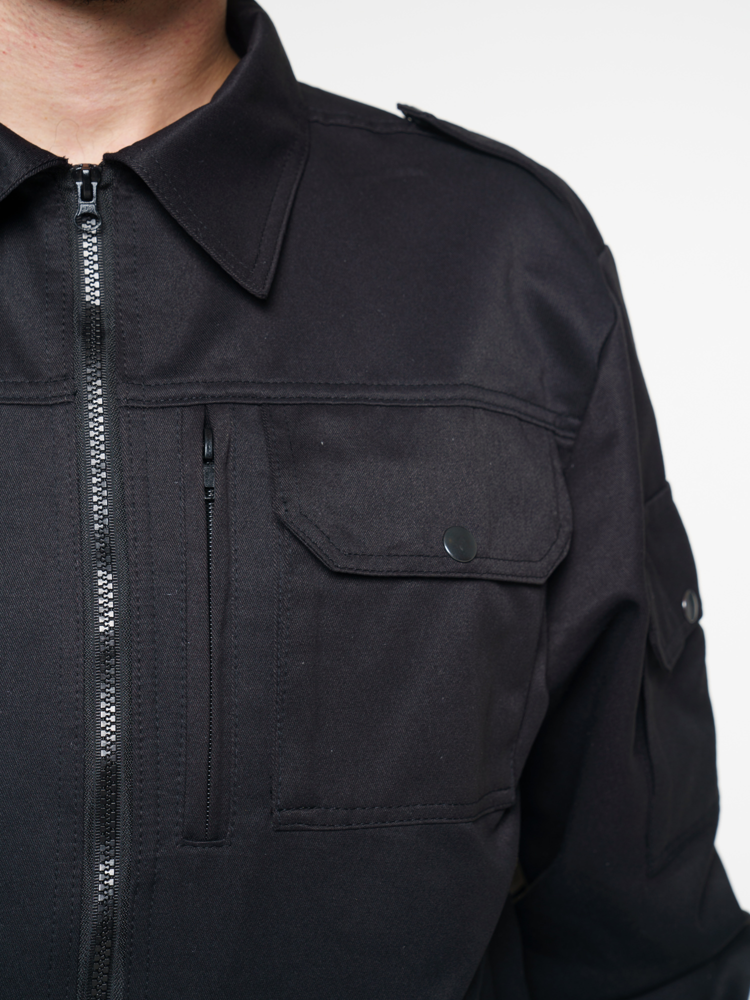 Оснащен объемными нагрудными карманами на клепках, имеет карман на молнии для документов.
