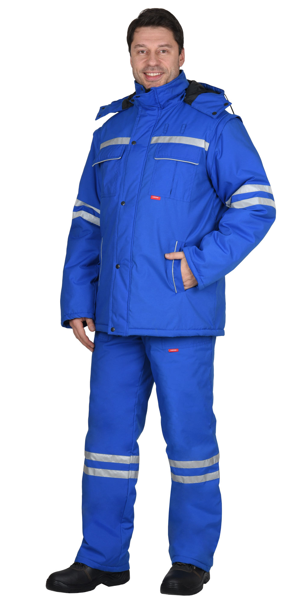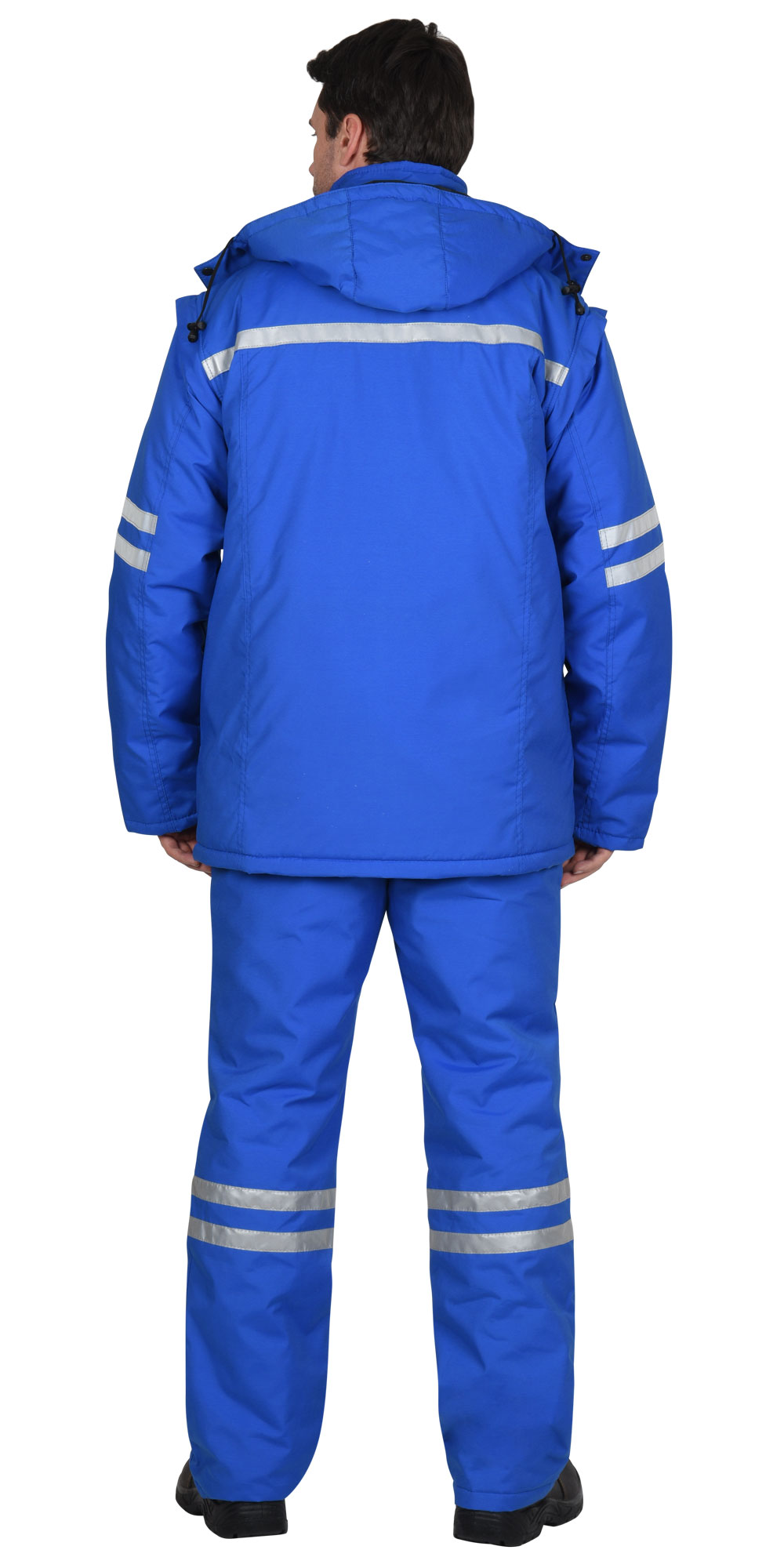 Костюм состоит из куртки и полукомбинезона. Куртка удлиненная прямого силуэта на утепленной подкладке. Центральная застежка - молния, прикрыта ветрозащитной планкой застегивающейся на кнопки. Два верхних кармана и два нижних прорезных кармана. Утепленный пристегивающийся на кнопки капюшон. Пристегивающиеся при помощи молнии рукава. Полукомбинезон на утепленной подкладке с застежкой на молнию. Два нижних кармана с косым входом и один задним накладным карманом. В костюме предусмотрены светоотражающие полосы 25мм для обозначения сигнальной видимости.