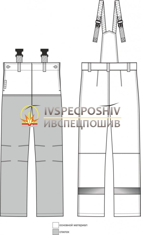 Брюки прямого силуэта с откидывающейся передней частью, с застежками в боковых швах на одну пуговицу и застежкой задней половины спереди на одну пуговицу. На поясе брюк пять шлевок - две на передних половинках и три на задних. Брюки имеют внутренние боковые карманы с подкладкой из бязи. Вентиляционные отверстия расположены в области шаговых швов.