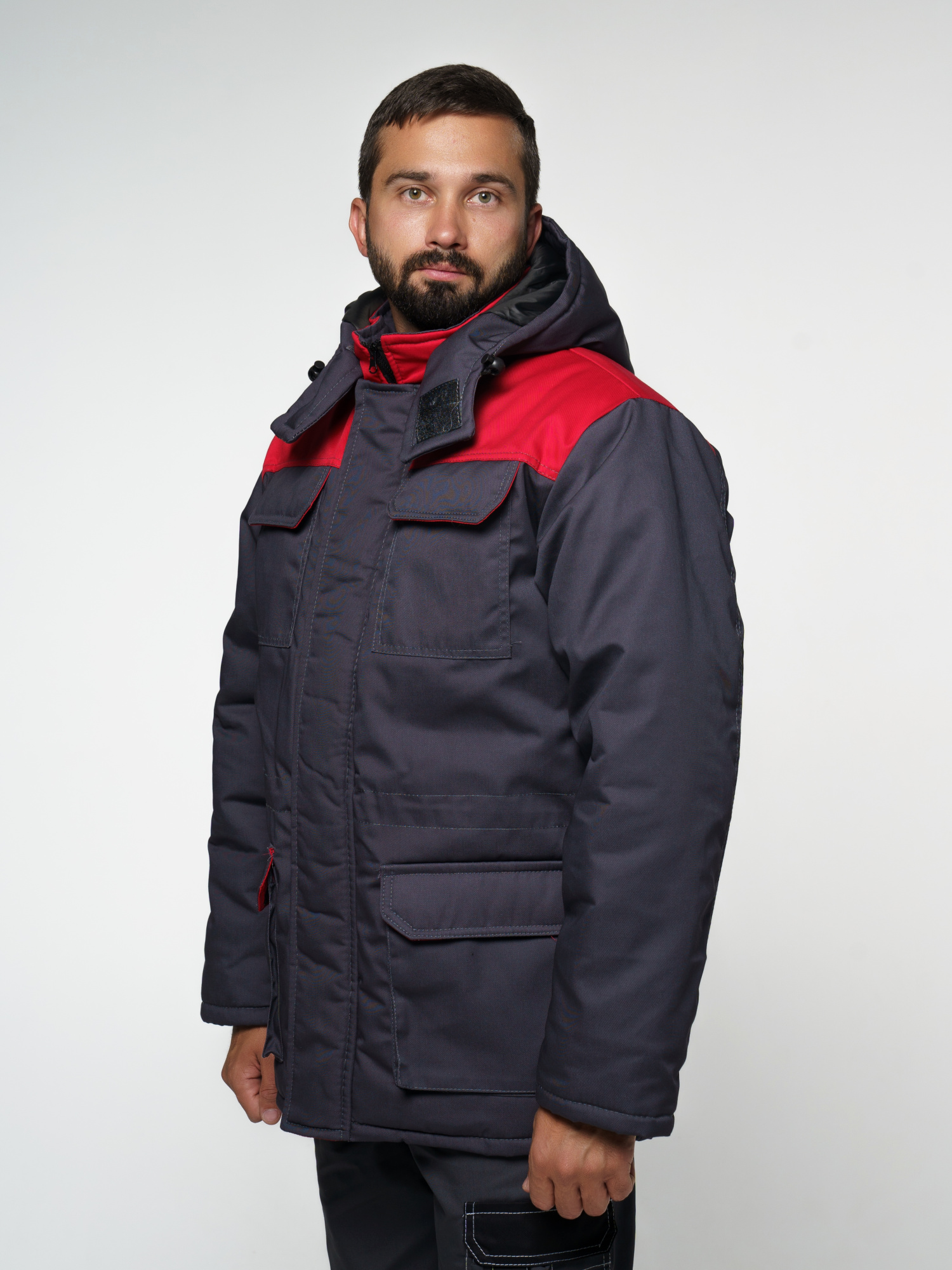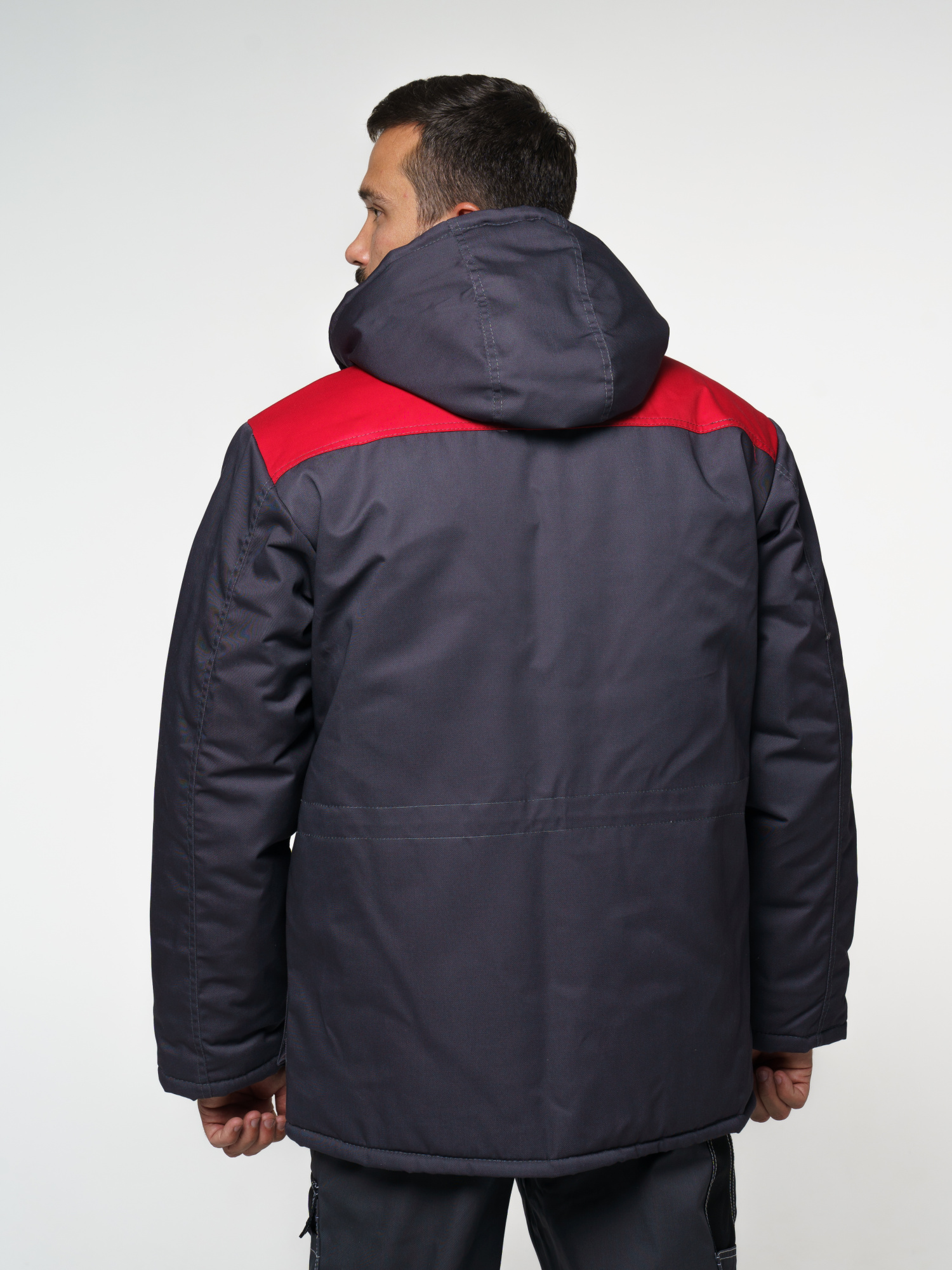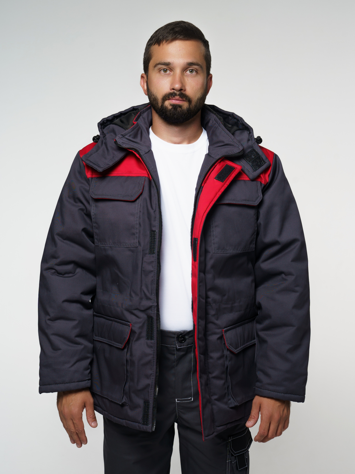 Куртка прямого силуэта, с центральной застежкой на молнию с ветрозащитной планкой на липучках. Нагрудные накладные карманы и нижние объемные накладные карманы-портфель с клапаном на липучках. В рукавах трикотажные манжеты-напульсники. По линии талии кулиса со шнуром-резинкой и фиксатором. Воротник-стойка. Съемный утепленный капюшон на пуговицах, по лицевому вырезу кулиса со шнуром-резинкой и фиксаторами, по лицевой части застегивается на липучки. Подкладка простегана с утеплителем, внутренний накладной карман на левой полочке.