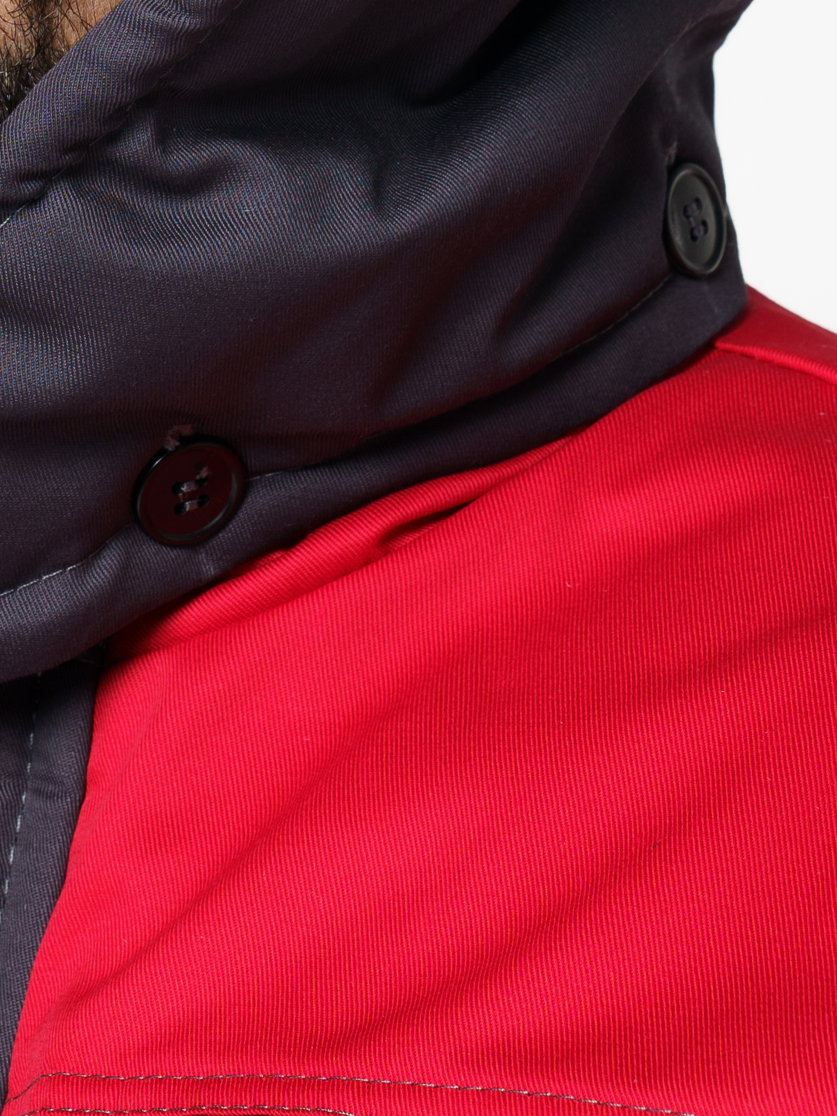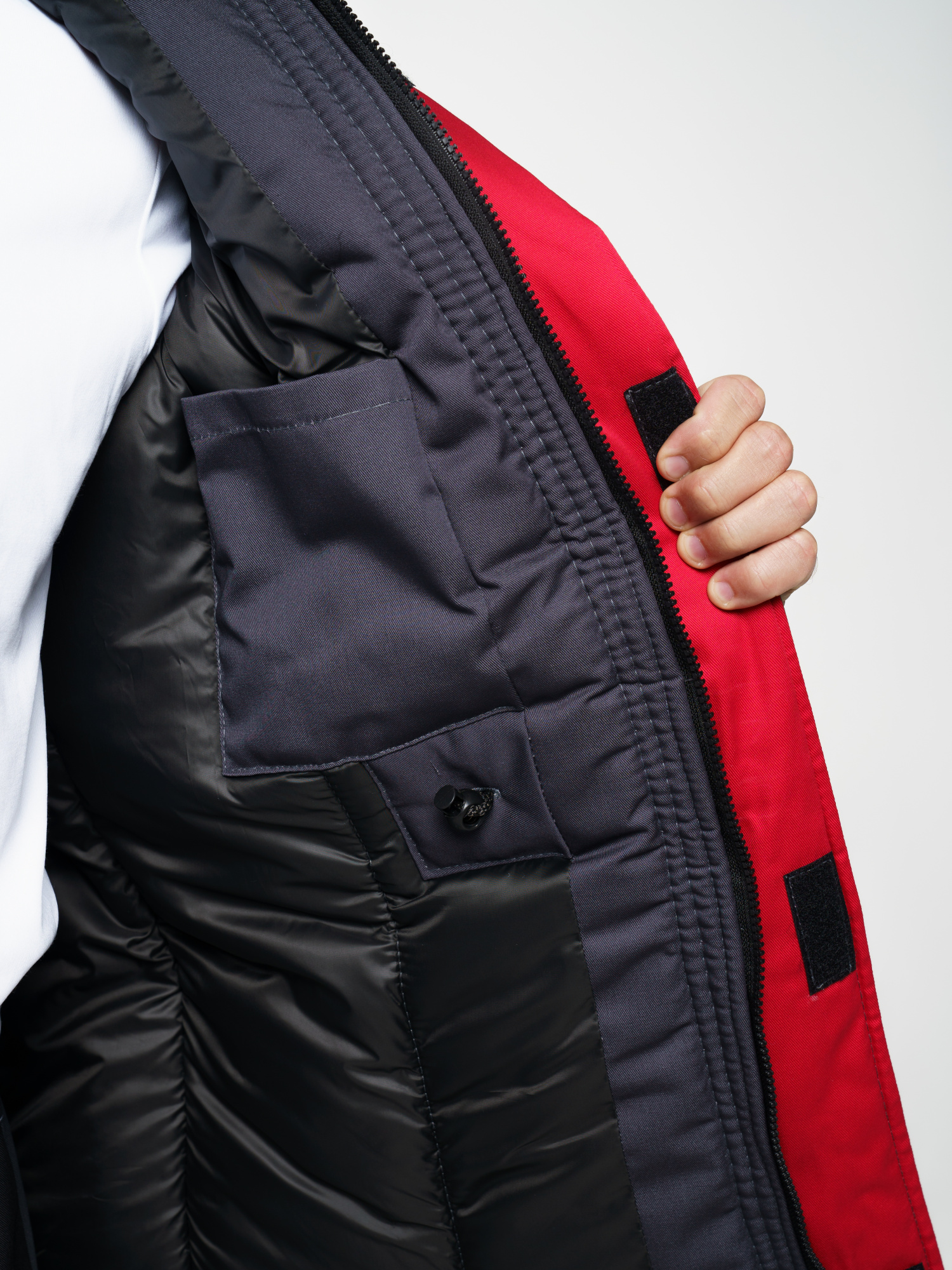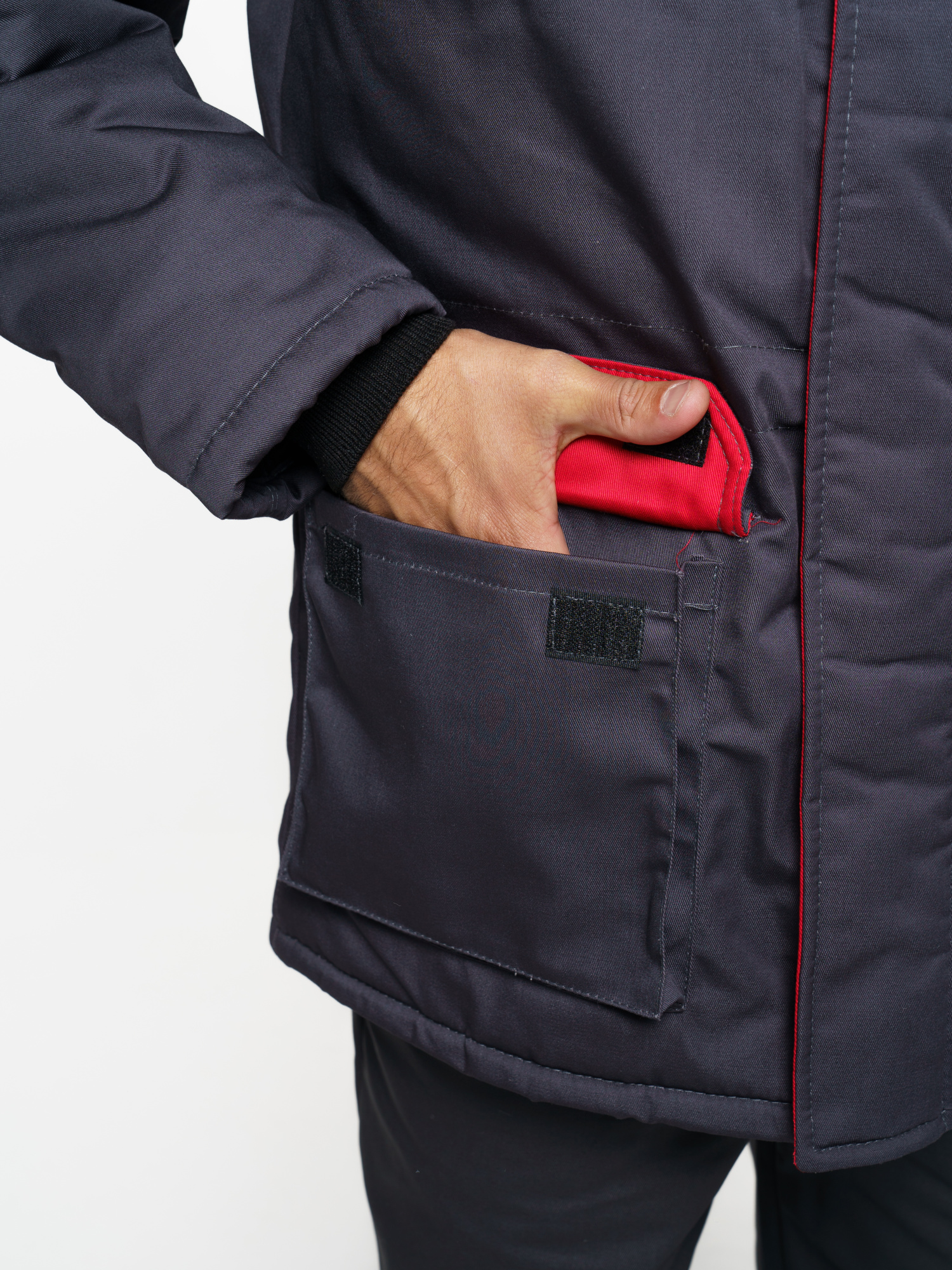 Куртка прямого силуэта, с центральной застежкой на молнию с ветрозащитной планкой на липучках. Нагрудные накладные карманы и нижние объемные накладные карманы-портфель с клапаном на липучках. В рукавах трикотажные манжеты-напульсники. По линии талии кулиса со шнуром-резинкой и фиксатором. Воротник-стойка. Съемный утепленный капюшон на пуговицах, по лицевому вырезу кулиса со шнуром-резинкой и фиксаторами, по лицевой части застегивается на липучки. Подкладка простегана с утеплителем, внутренний накладной карман на левой полочке.