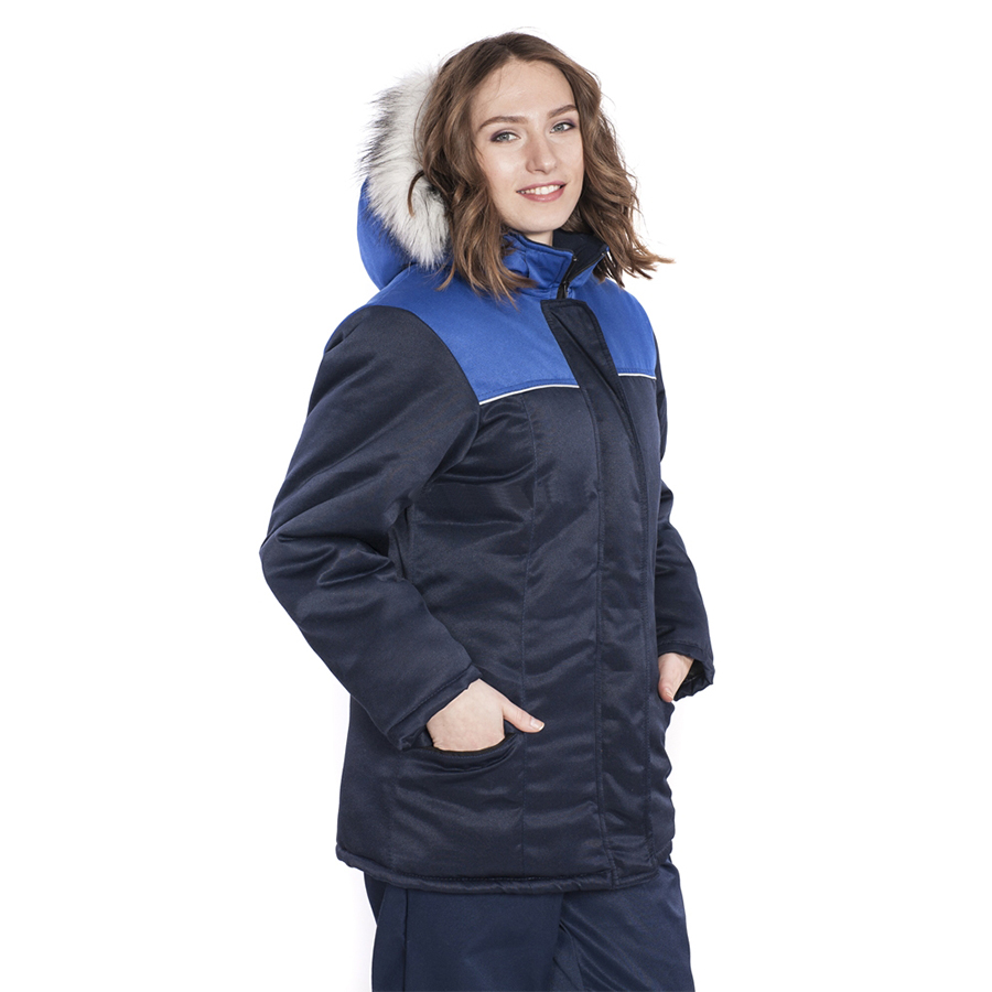Куртка удлиненная, с рельефами на полочках. Центральная застежка на молнию, закрытую ветрозащитным клапаном на «липучках». Воротник - стойка, внутри выполнен из флиса. Боковые карманы - внутренние, на молнии. Рукава -втачные, внутри имеют трикотажные напульсники. По кокеткам спинки и полочек втачан светоотражающий кант. Ширина по линии талии регулируется резинкой. Утепленный капюшон пристегивается при помощи молнии и отделан по лицевому вырезу искусственным мехом.