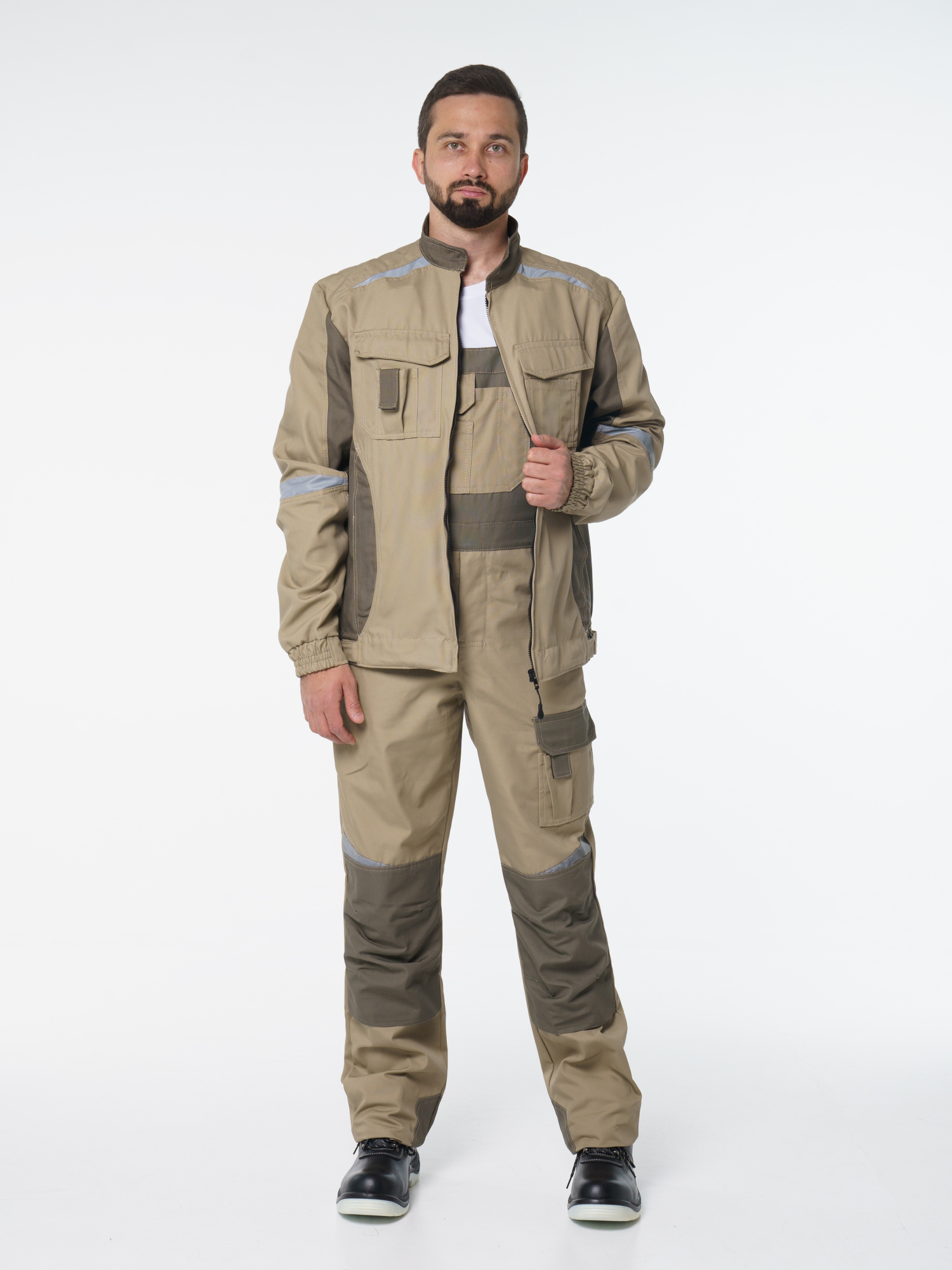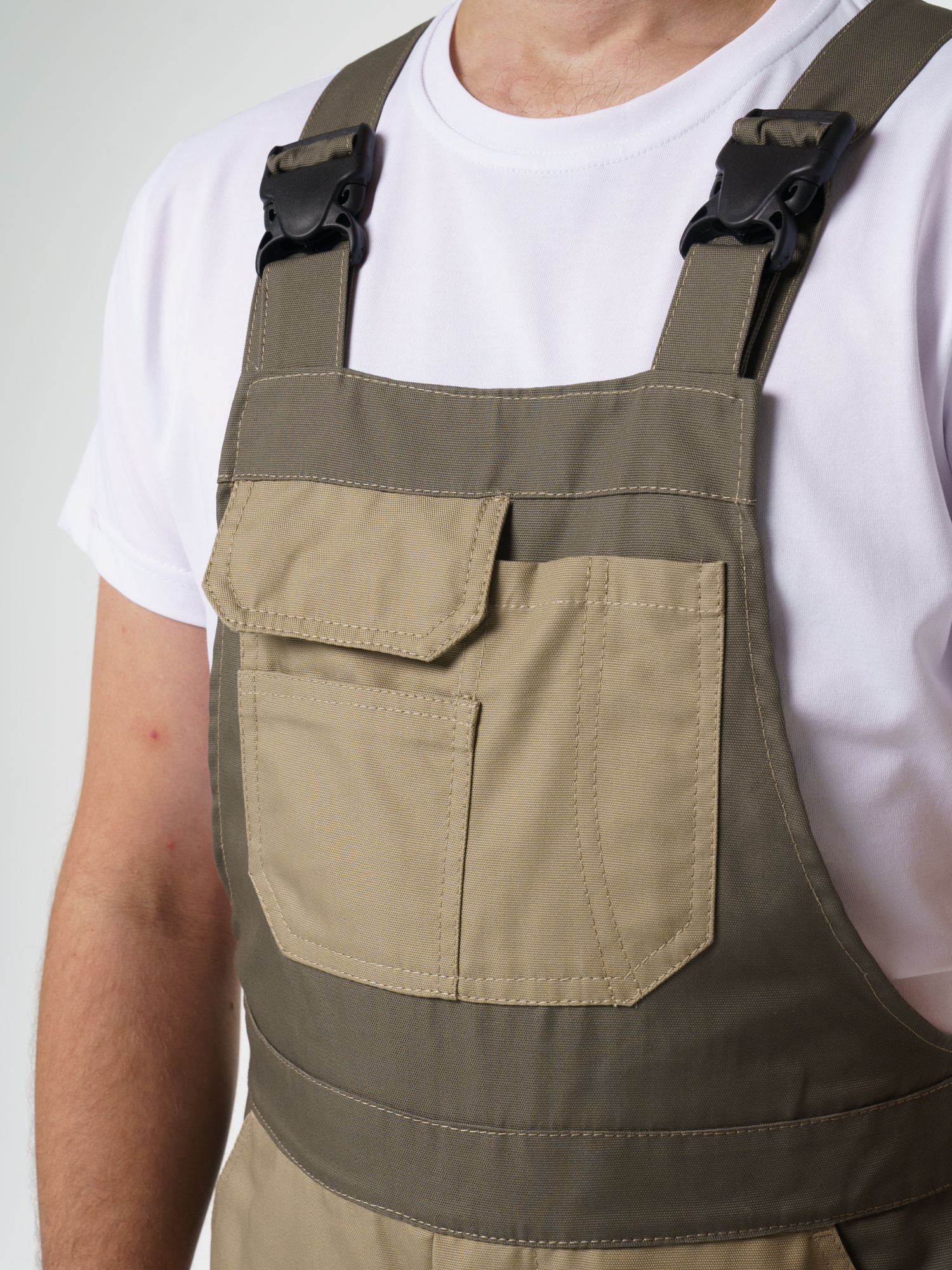 Полукомбинезон с застёжкой гульфика на молнию и застёжкой в боковом шве на пуговицы; с различными многофункциональными карманами; с объемными наколенниками. В полукомбинезоне предусмотрена лента светоотражающая (мелкодисперсная белая) фигурной формы.