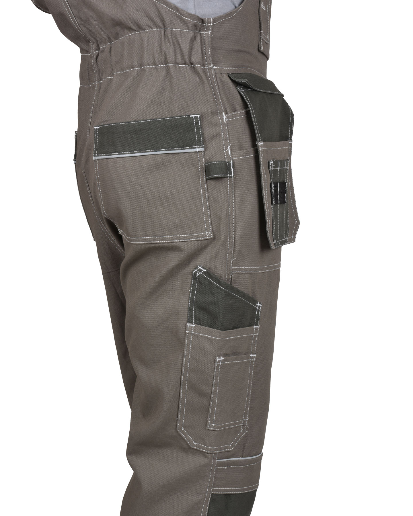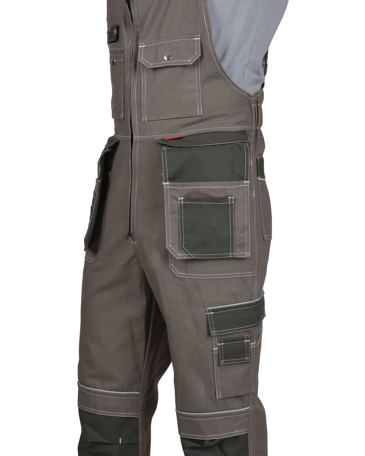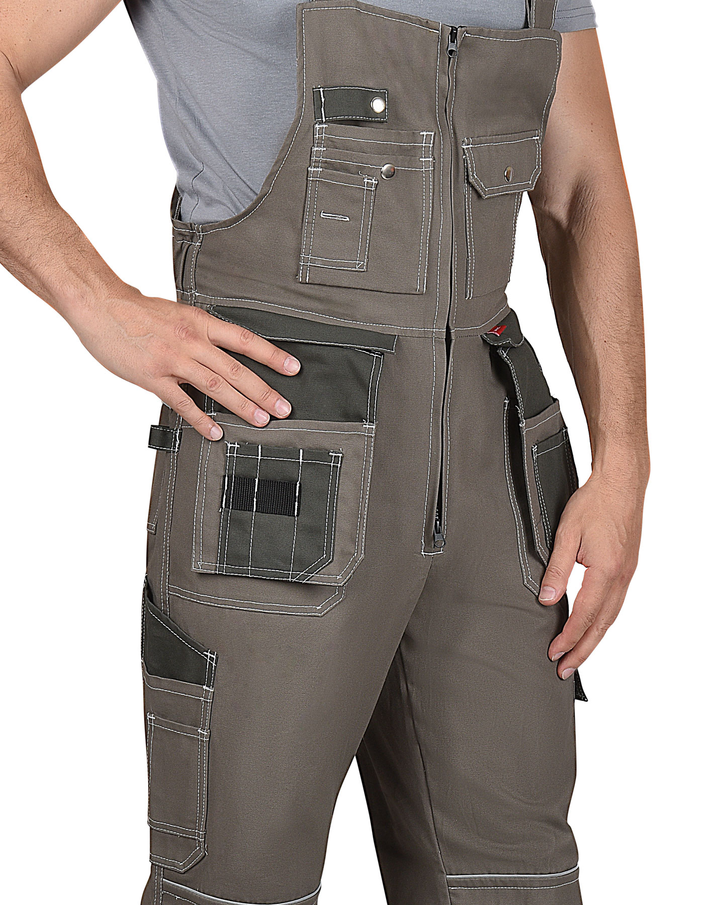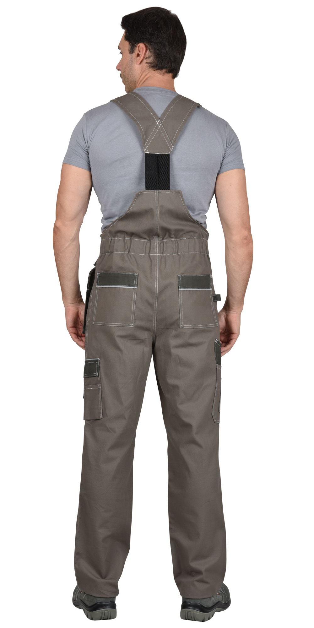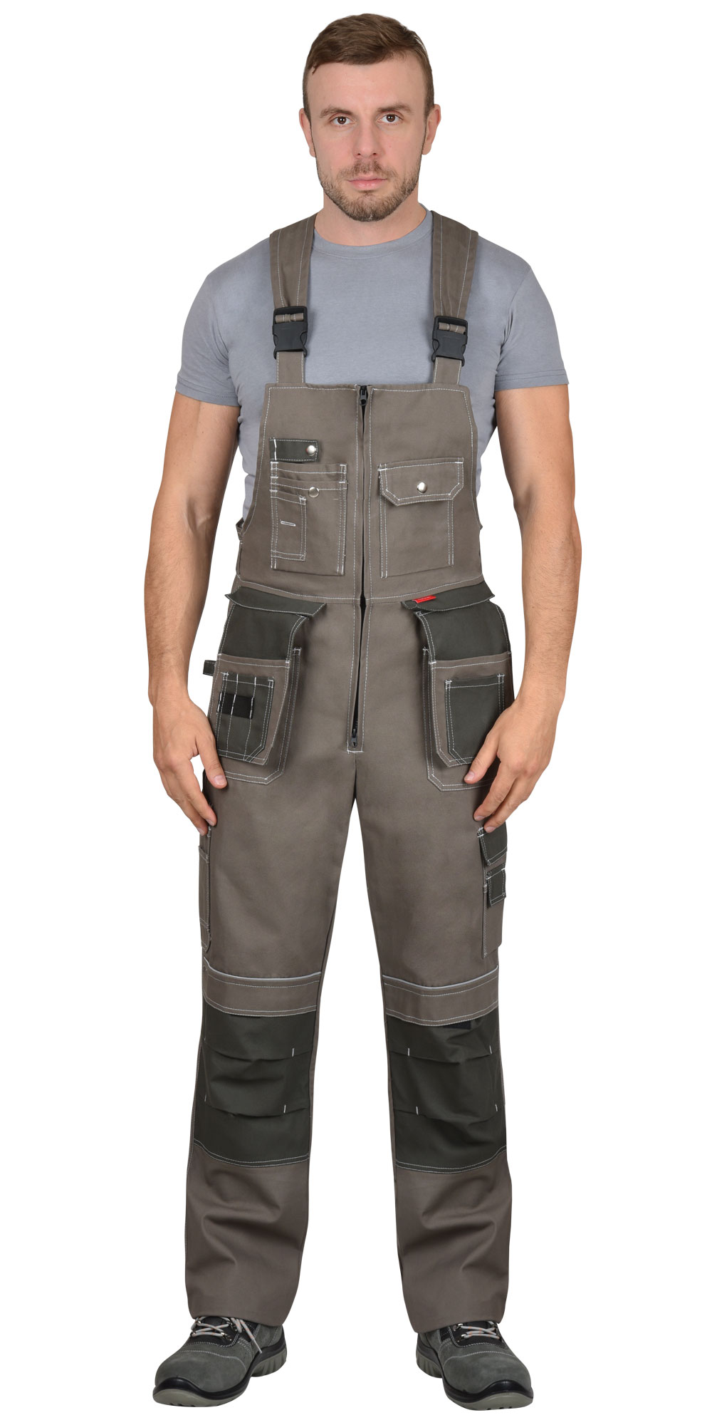 Полукомбинезон выполнен из ткани "Канвас Комфорт", прямого силуэта, с центральной застежкой на тесьму – «молния» R-вида, с различными многофункциональными карманами, с кулисой по спинке на резинку ткацкую, с объёмными наколенниками и бретелями регулируемыми резинкой помочной и фастексам. В полукомбинезоне вшивается кант СВ 3 мм светоотражающий 100 К для обозначение сигнальной видимости.