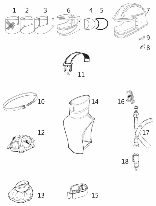 В комплектацию шлема также входит пелерина, сменный хлопковый воротник, шланг для подсоединения к фильтру, редуктор давления и поясной ремень. Пелерина надежно защищает торс оператора от потенциальных факторов, представляющий опасность поражения.