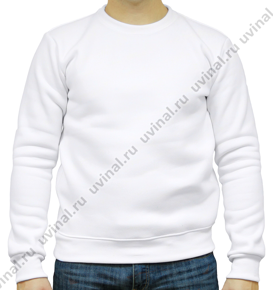 Плотная толстовка без капюшона белого цвета прямого покроя, состоит из турецкого трикотажного полотна футера из 3-х ниток с начесом плотностью 340 грамм/кв.метр. Манжеты рукавов, низ и горловина однотонного чисто белого свитшота изготовлены из эластичного трикотажного полотна "рибана".