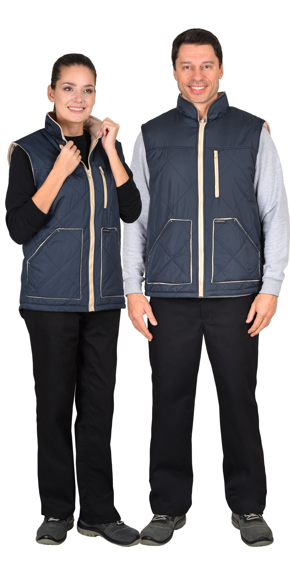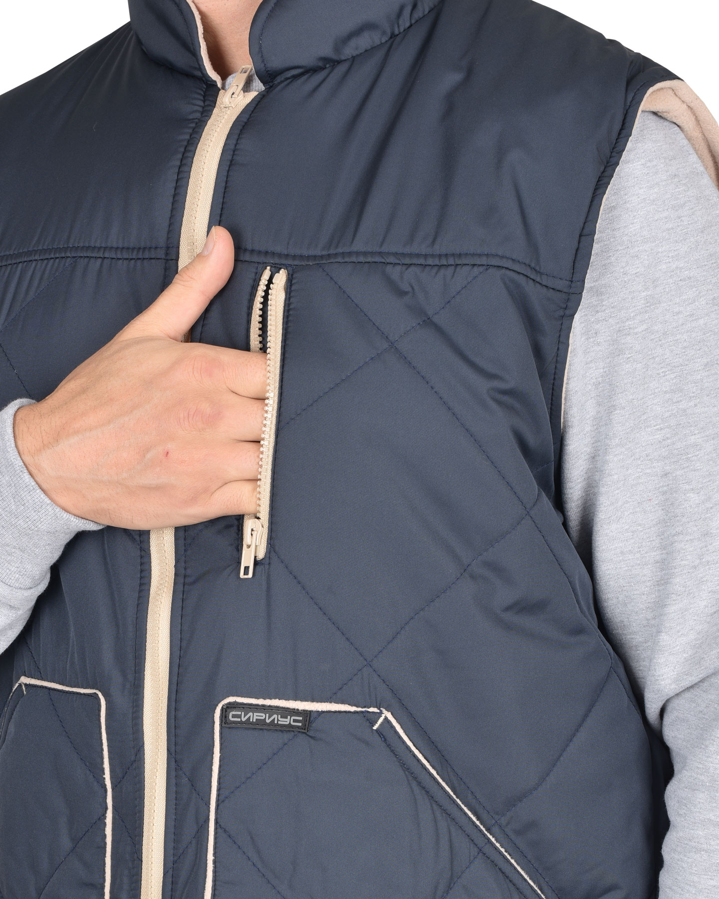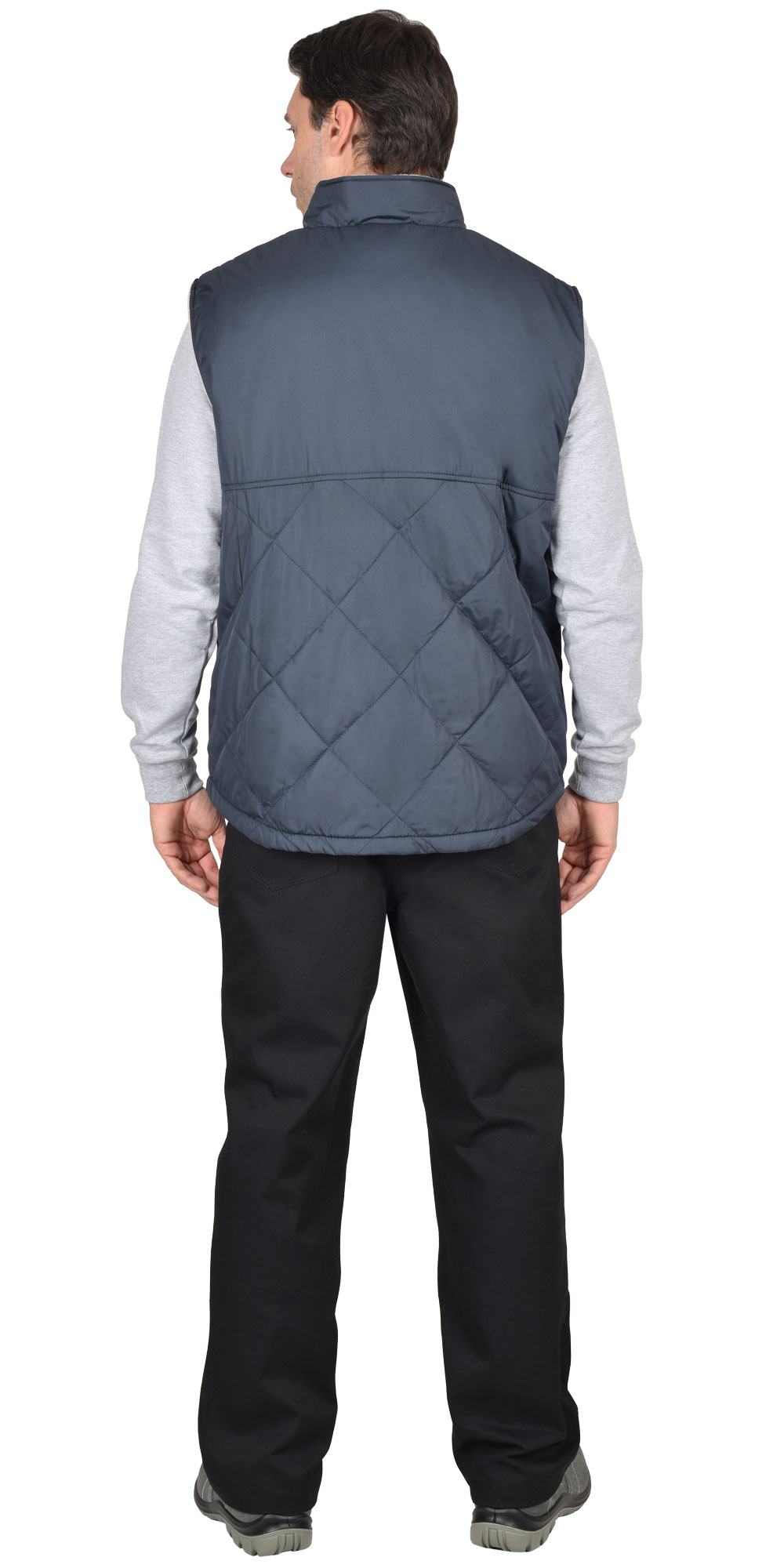 Жилет утеплённый, стёганный, прямого силуэта, на подкладке из флиса с центральной бортовой застёжкой на молнию, с воротником стойка, с нагрудным карманом с молнией и нижними фигурными утеплёнными карманами. Жилет с удлинённой спинкой. ГОСТ 25295-2003