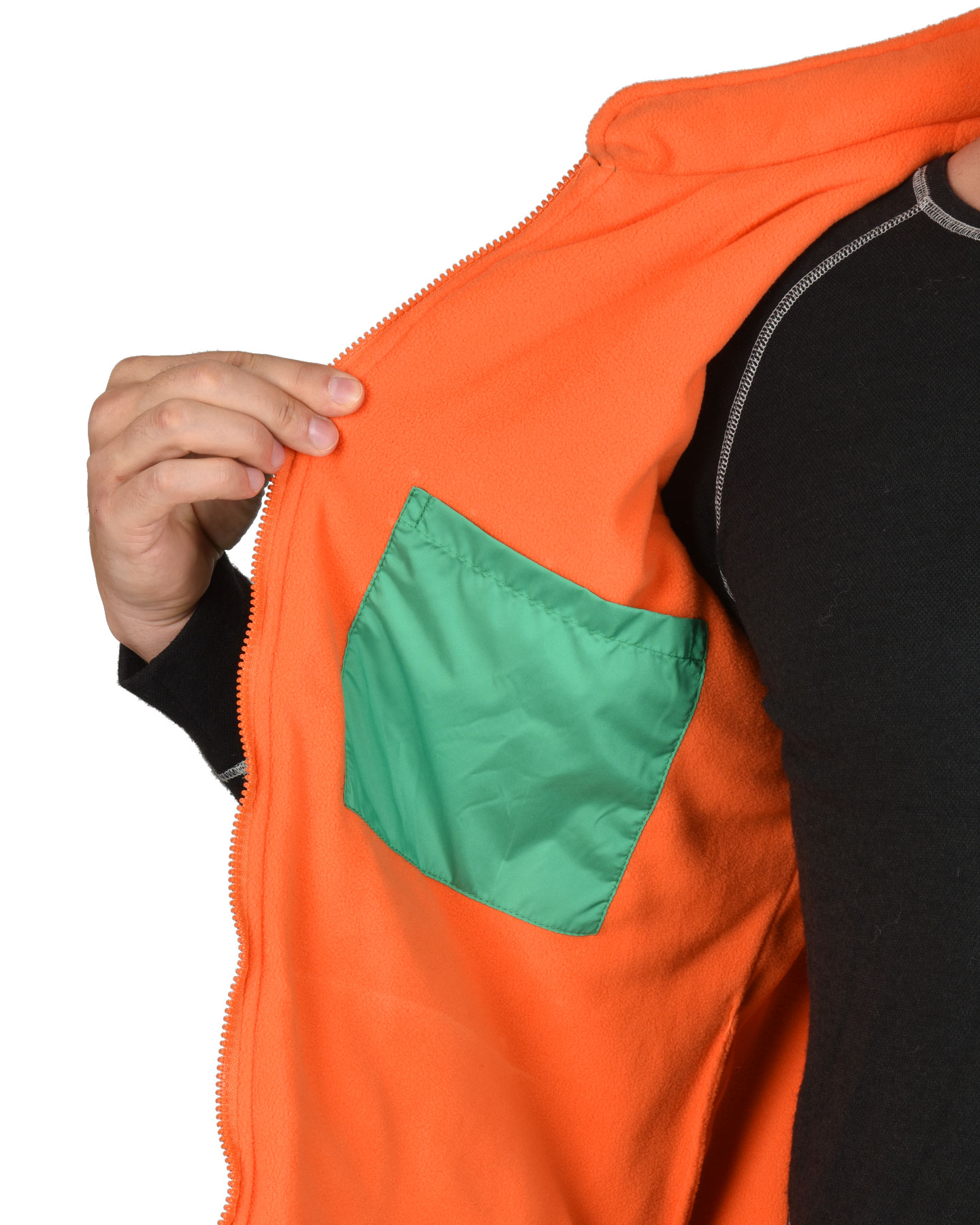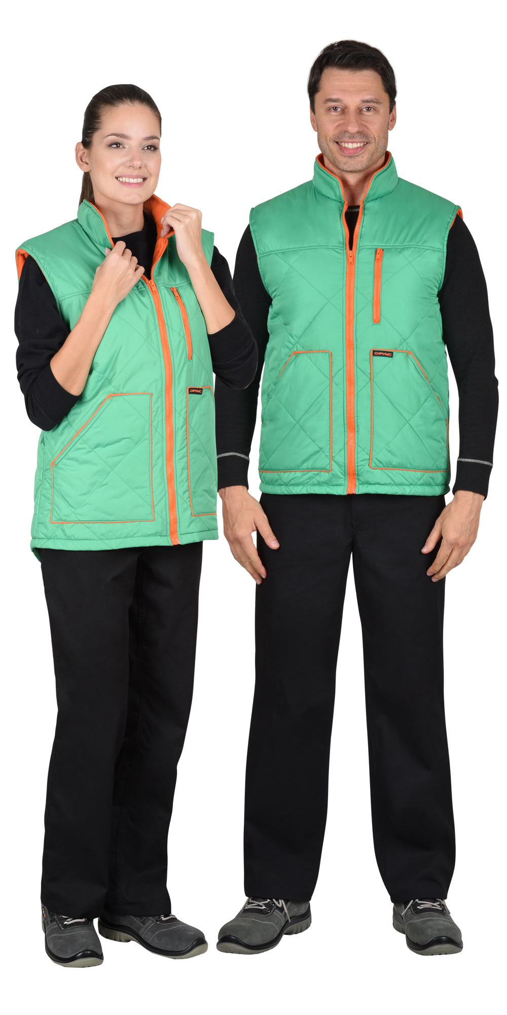 Жилет утеплённый, стёганный, прямого силуэта, на подкладке из флиса с центральной бортовой застёжкой на молнию, с воротником стойка, с нагрудным карманом с молнией и нижними фигурными утеплёнными карманами. Жилет с удлинённой спинкой. ГОСТ 25295-2003