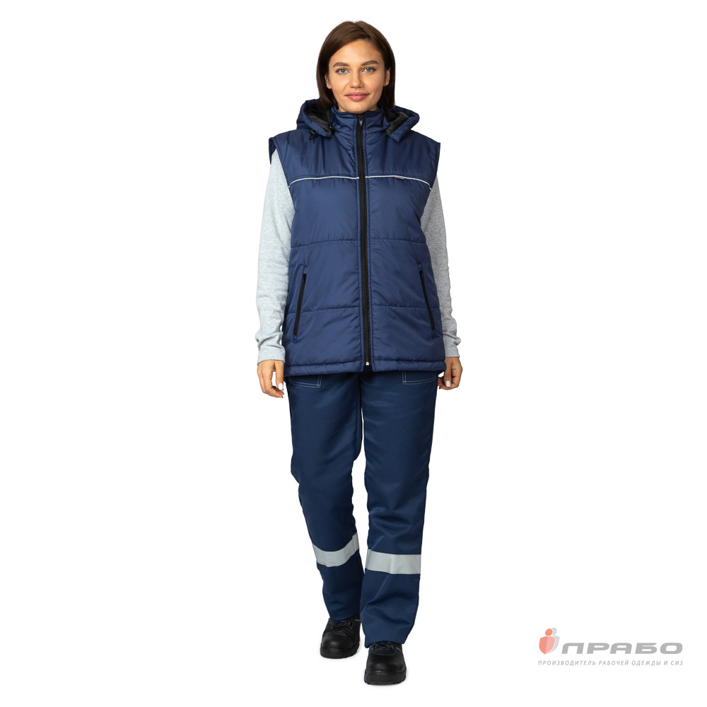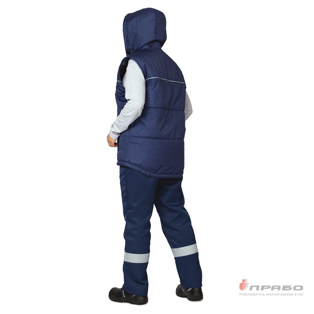 Жилет: утеплённый, прямого силуэта, с центральной застёжкой на тесьму «молнию». Стёганный двумя горизонтальными строчками. Спинка жилета удлинённая с фигурной линией низа. Воротник-стойка, внутренний воротник выполнен из флиса. Низ жилета регулируется по объёму с помощью кулиски с эластичным шнуром и фиксаторами.