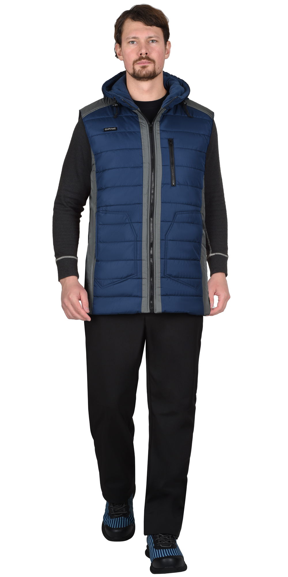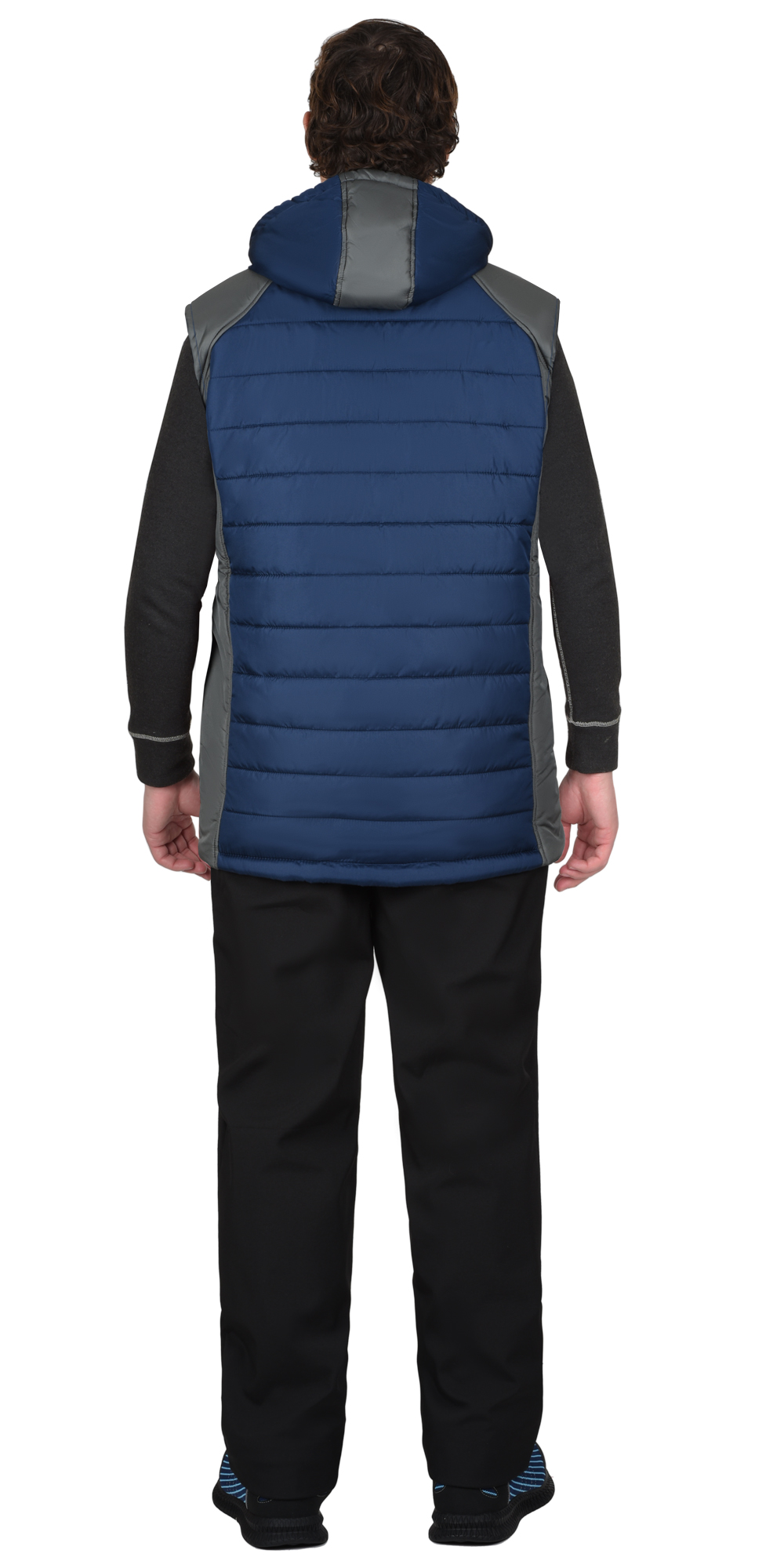 Жилет комбинированный из ткани двух цветов, с центральной застежкой на молнию, с удлиненной фигурной линией низа по спинке, с втачным капюшоном. Центральные части переда и спинки простеганы вместе с утеплителем. Жилет с левым нагрудным прорезным карманом на молнию, нижние карманы в швах. На подкладке с правой стороны накладной карман на молнию.
