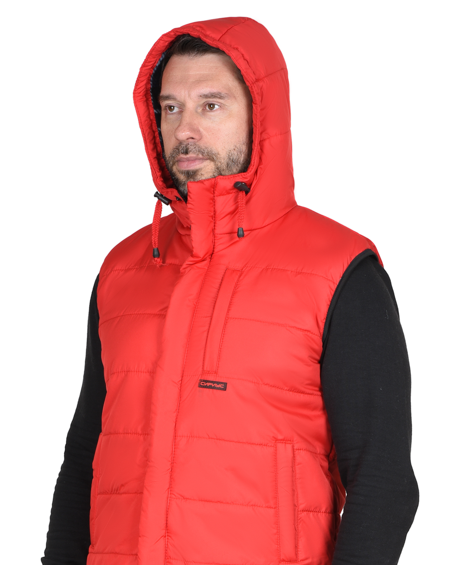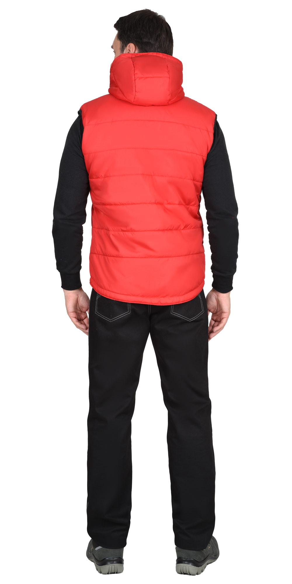 Жилет утеплённый, выстеган с утеплителем горизонтальными строчками, на флисовой подкладке контрастного цвета, с втачным капюшоном, с застёжкой на молнию, прикрытую ветрозащитным клапаном от края капюшона до низа изделия, застёгивающимся на кнопки. Жилет с одним нагрудным карманом с молнией и двумя нижними карманами. Спинка жилета, удлинённая с фигурной линией низа. Пройма окантована резинкой. Объём капюшона по лицевому вырезу регулируется шнуром с фиксаторами.
